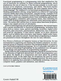 Aimed at both beginning and advanced programmers, this tutorial begins with a gentle introduction to functional programming, including basic ideas such as values, types, pattern matching, recursion, higher-order functions, data structures, polymorphism, abstraction, lazy evaluation, and proof by calculation. It then moves rapidly on to more advanced topics, such as infinite data structures, type classes, higher-order types, IO, monads, and inductive proofs. Details about programming in Haskell are presented in boxes throughout the text for easy reference.